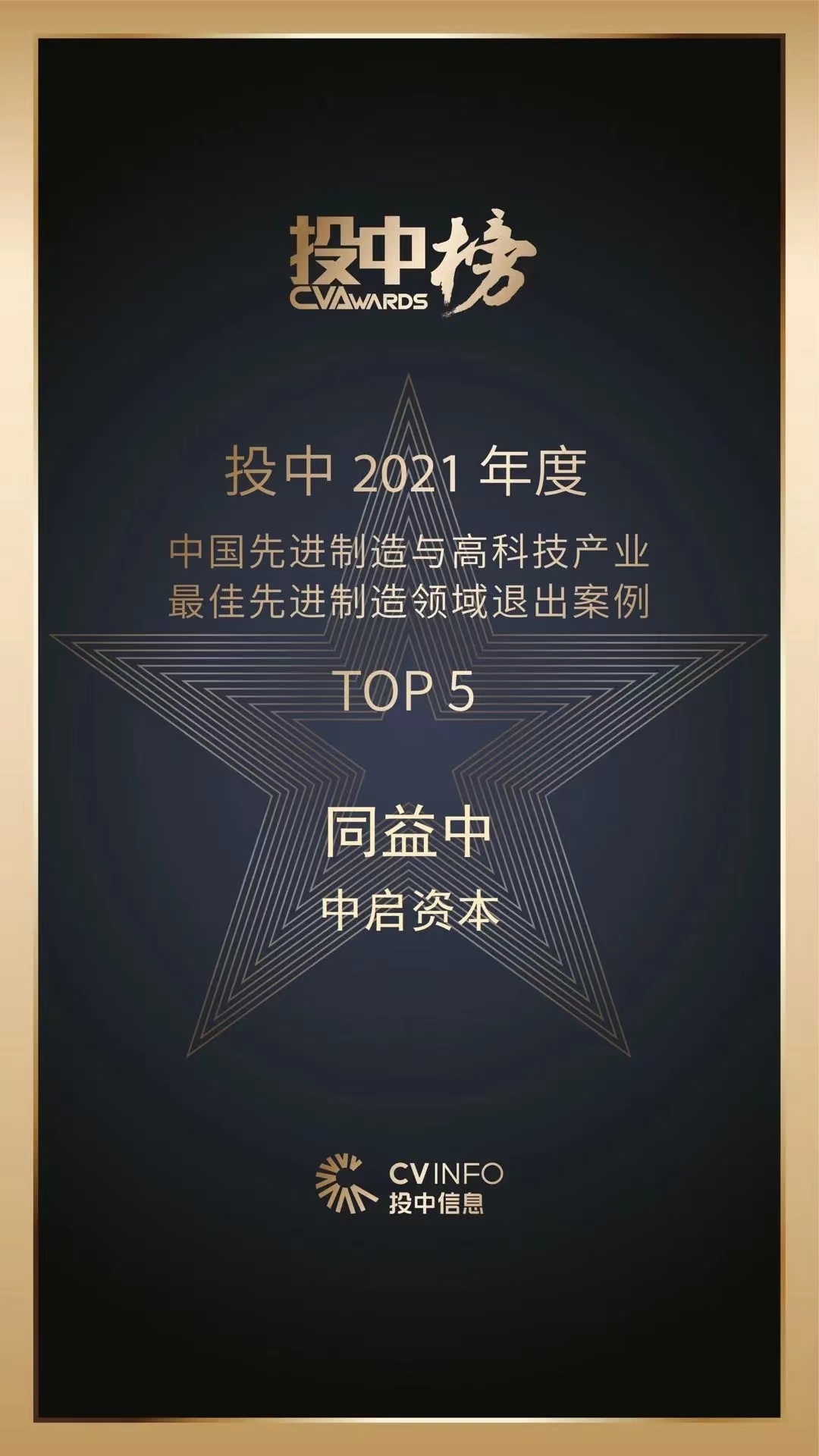 ➤➤➤ 2022年5月30日,“投中2021年度榜单”隆重揭晓,中启资本喜提“投中2021年度中国最佳私募股权投资机构TOP100”,中启资本投资的同益中项目获评“投中2021年度中国先进制造与高科技产业最佳先进制造领域退出案例TOP5”。