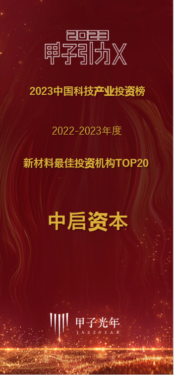 2023年8月22日,甲子光年“2022-2023年度中国科技产业投资榜”隆重揭晓,中启资本凭借多年在新材料、新能源领域的布局以及给投资人带来的长期持续回报,斩获“2022-2023 年度新材料最佳投资机构 TOP20”大奖。