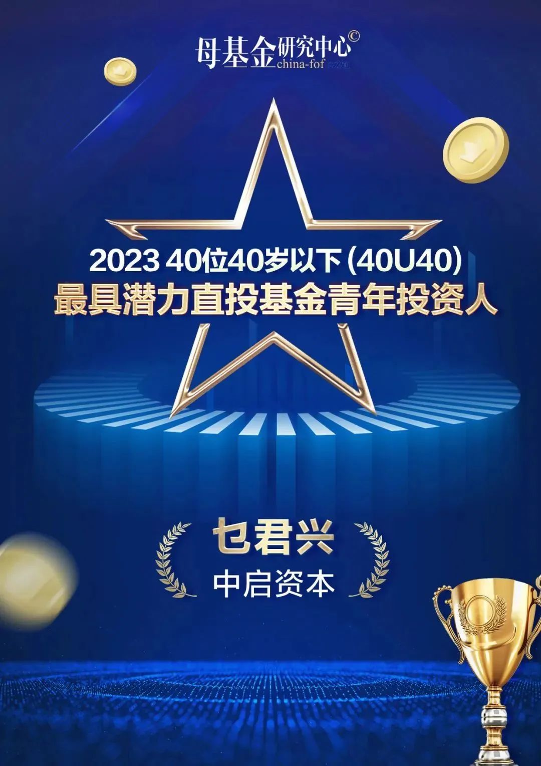 2023年5月4日,母基金研究中心“2023 40U40优秀青年投资人榜单” 隆重揭晓,中启资本合伙人乜君兴凭借优异的投资业绩,斩获“最具潜力直投基金青年投资人”大奖。