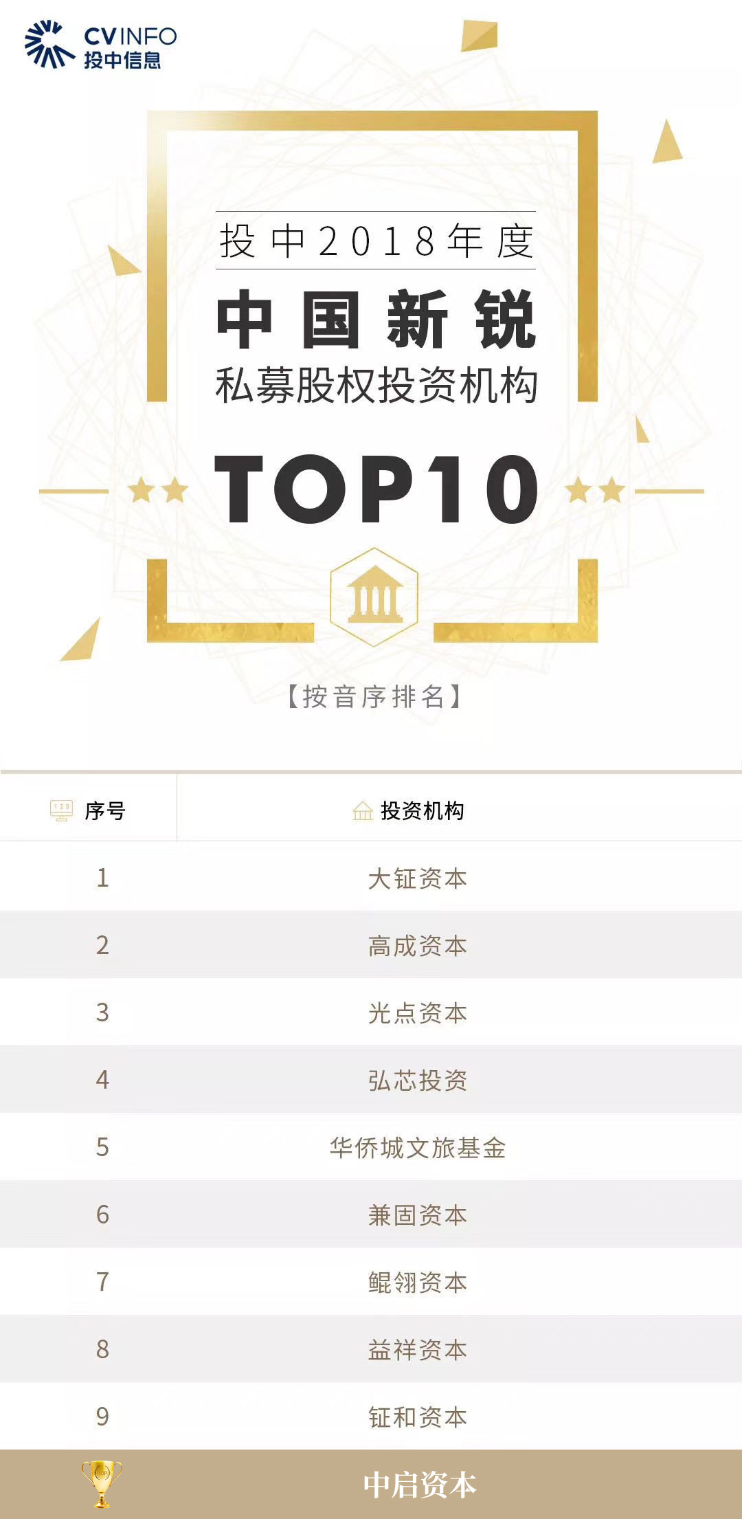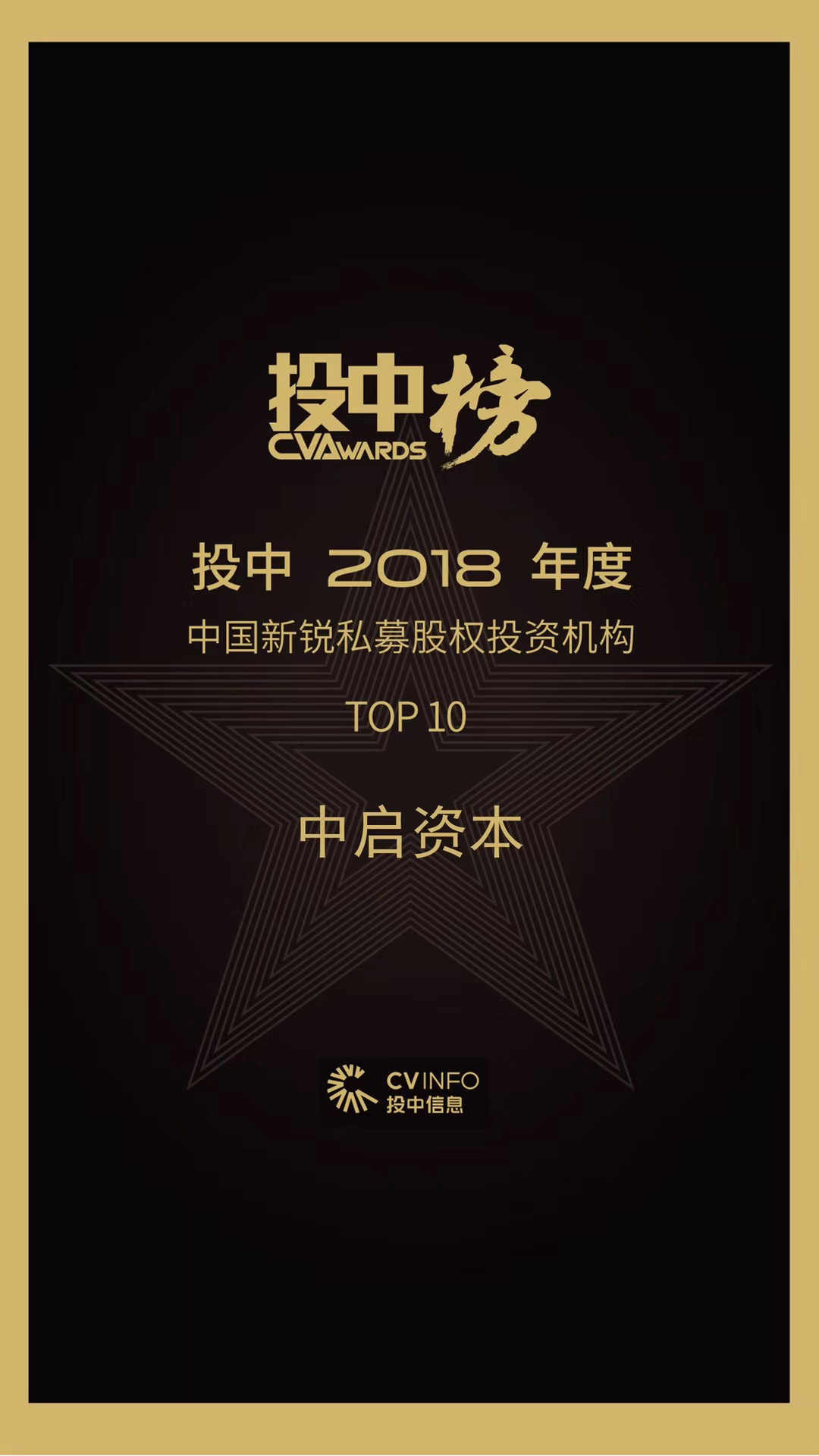 2019年4月17日,“投中2018年度榜单”在上海揭晓,中启资本首次参选并获得“投中2018年度中国新锐私募股权投资机构TOP10”奖项。